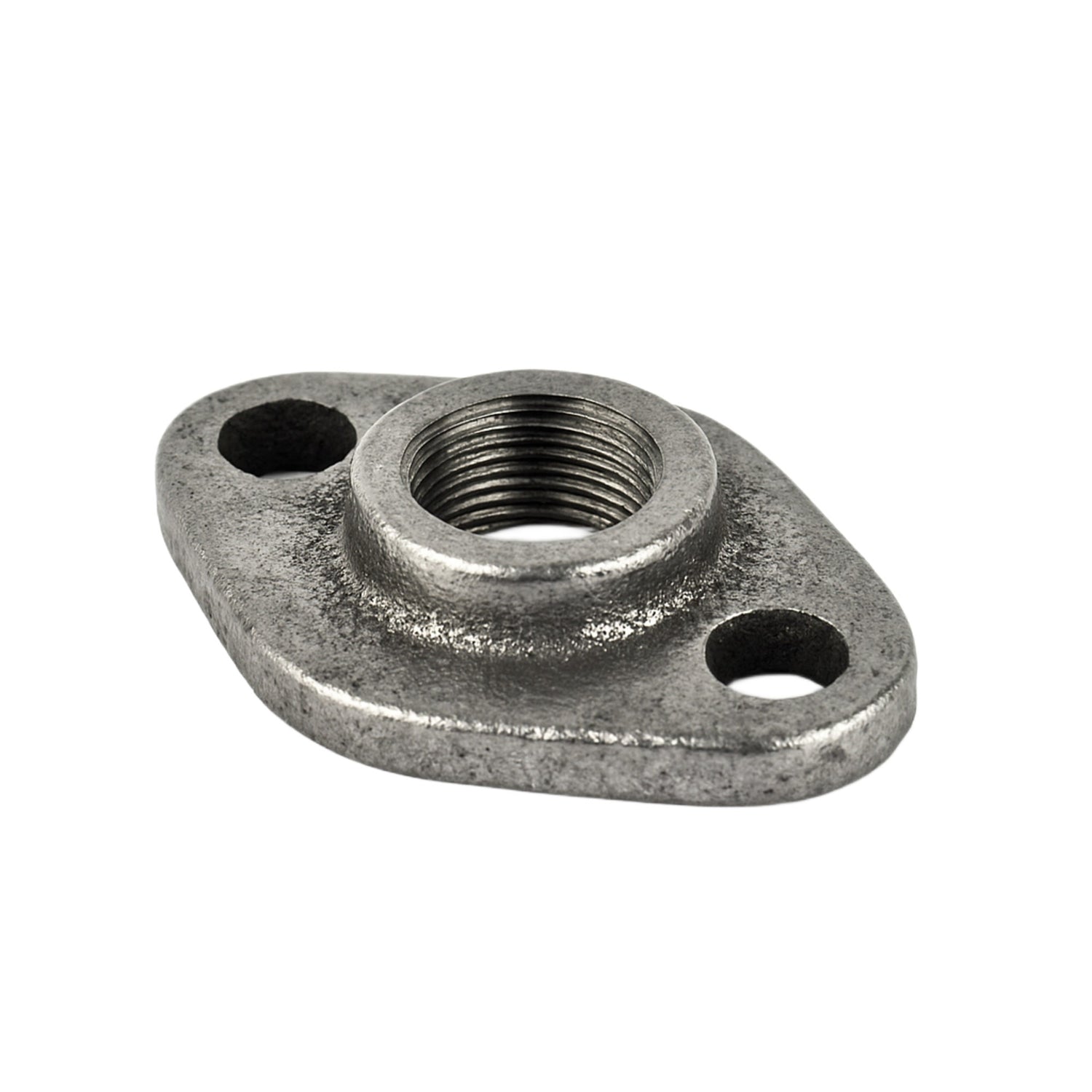 Black cast iron oval plate for fixing threaded pipes or fittings. This Flange is ideal for fixing your structure to a partition, ceiling or simply laying it on the floor. The oval shape limits the surface area required for fixing. Fixing is easy with just 2 holes (large hole diameter: 12mm).