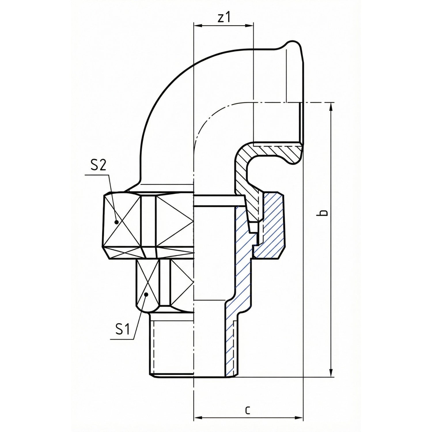 | Size | DN | Fitting Ø | b (mm) | c (mm) | z1 (mm) | s1 / s2 (Keys mm) | Est. W (Width O.A.) | Est. H (Height O.A.) |