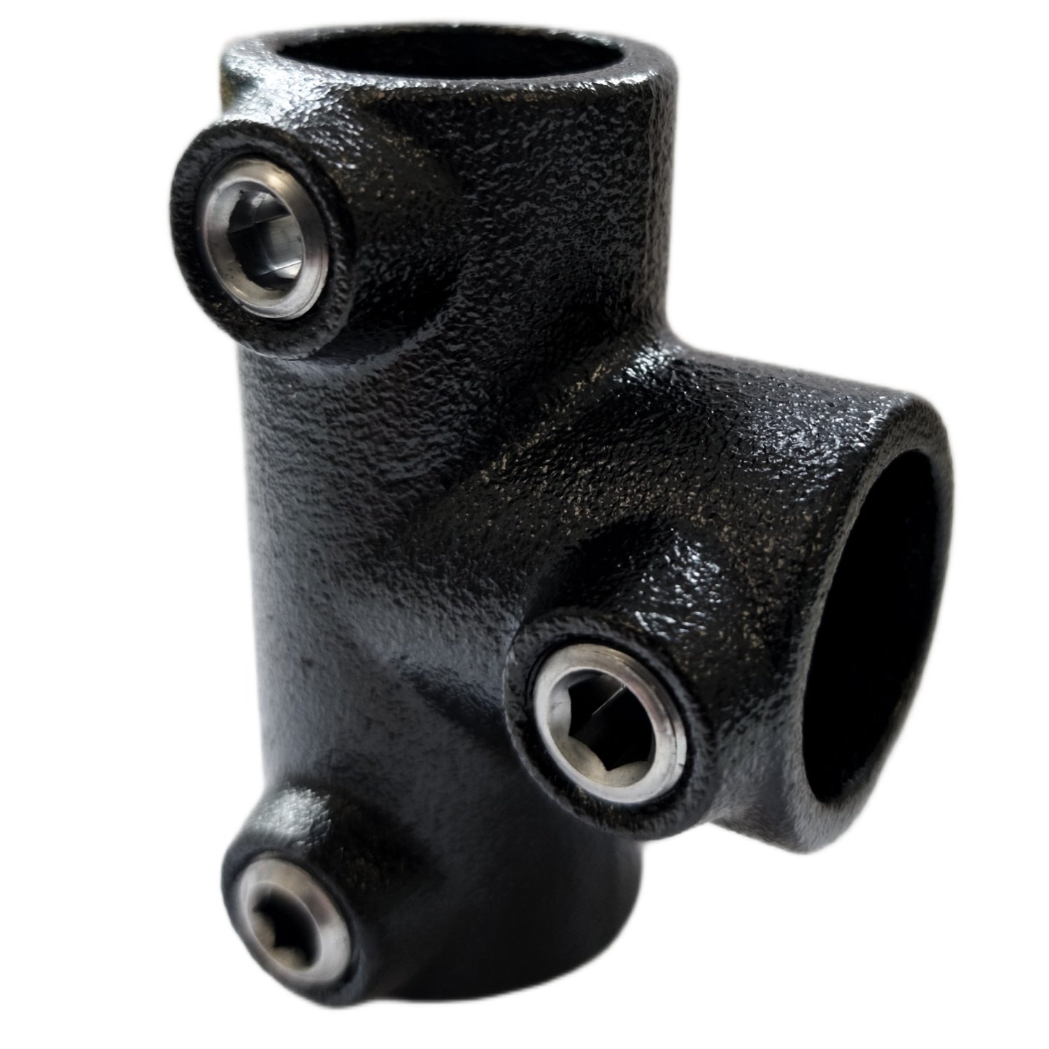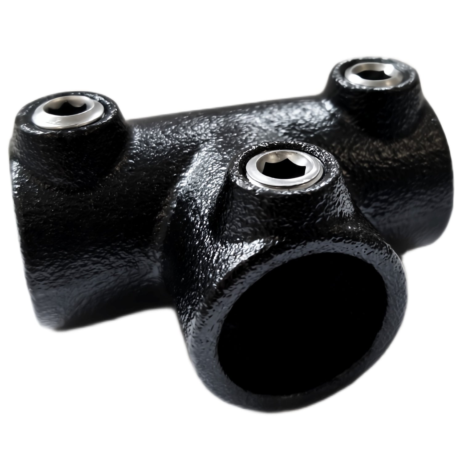 The BTR T connector with a black painted finish connects three perpendicular tubes in industrial-style decorative structures. Its Allen screw locking system ensures a strong, discreet fit with no threading or welding required. This T fitting is perfect for creating complex metal frames while maintaining a sleek, modern look.